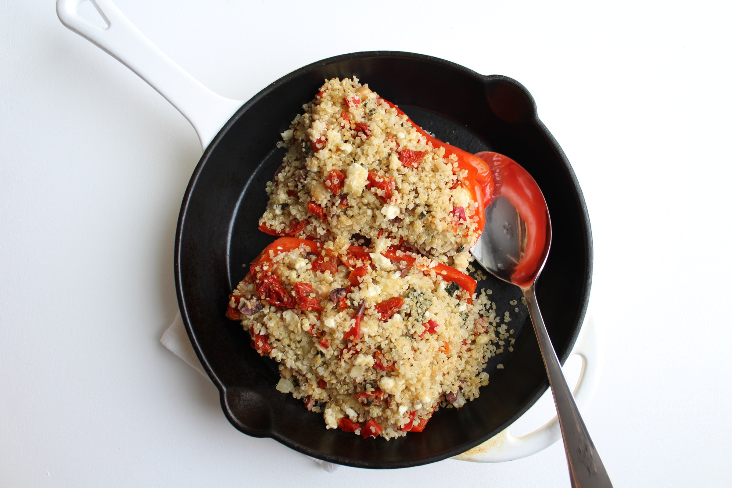 Yield: 4-6 servings Ingredients 2-3 large bell peppers 1 Tablespoon olive oil 3 cups quinoa, cooked (rice, barley or cauliflower rice also work) 2 cups fresh spinach or kale ½ cup sundried tomatoes, finely diced 1 can chick peas (drained and rinsed) ¼ cup kalamata olives, diced ½ cup feta cheese, crumbled ½ teaspoon …