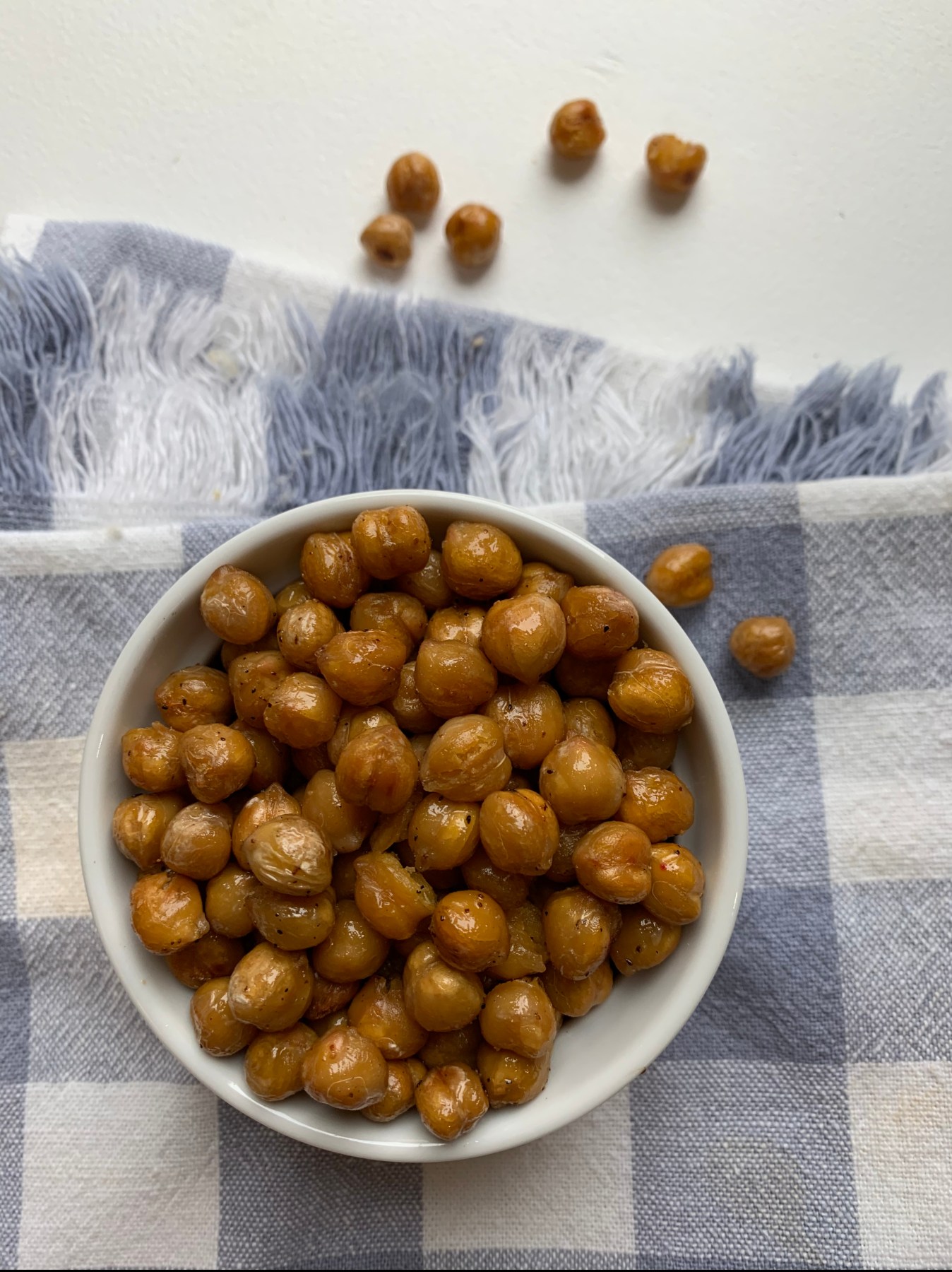 Ingredients: 1 can chick peas, drained and rinsed 2 Tbsp olive oil 1 tsp garlic powder (or seasoning of choice) 1/2 tsp salt Directions: Preheat oven to 375 degrees. Toss chick peas in the olive oil and seasonings. Evenly spread the chick peas onto a baking sheet. Roast the chick peas for 20-25 minutes, …