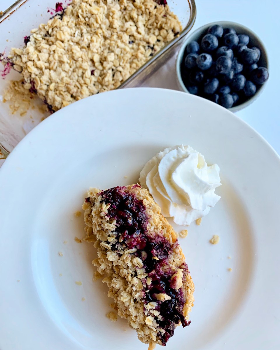 3. Press 2/3 of the crumble mixture into an 8×8 pan or a loaf pan. Spread the blueberry mixture evenly over the crust layer. Top with the remaining crumble mix and bake at 350 for 30 minutes or until lightly golden.