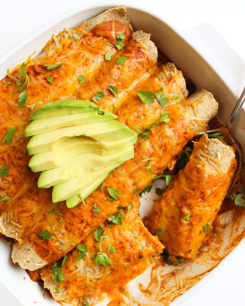 - Fill each tortilla with ⅓ -½ cup of filling and roll tightly. Place each enchilada close to one and other in a baking dish.