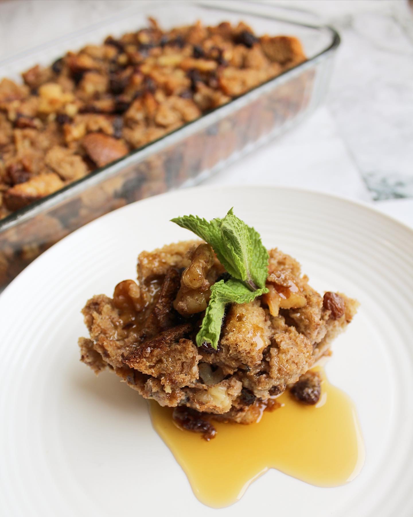 Yield: 8-10 servings Ingredients: 6 eggs 2 cups milk (sub non-dairy if needed) 1/4 cup maple syrup 2 tsp cinnamon 1 tsp vanillla 1/2 tsp salt 1 loaf bread, torn into small pieces 1/2 cup walnuts, chopped 1/2 cup raisins Directions: Preheat oven to 350 degrees. Whisk the eggs, milk, maple syrup, cinnamon, vanilla and …