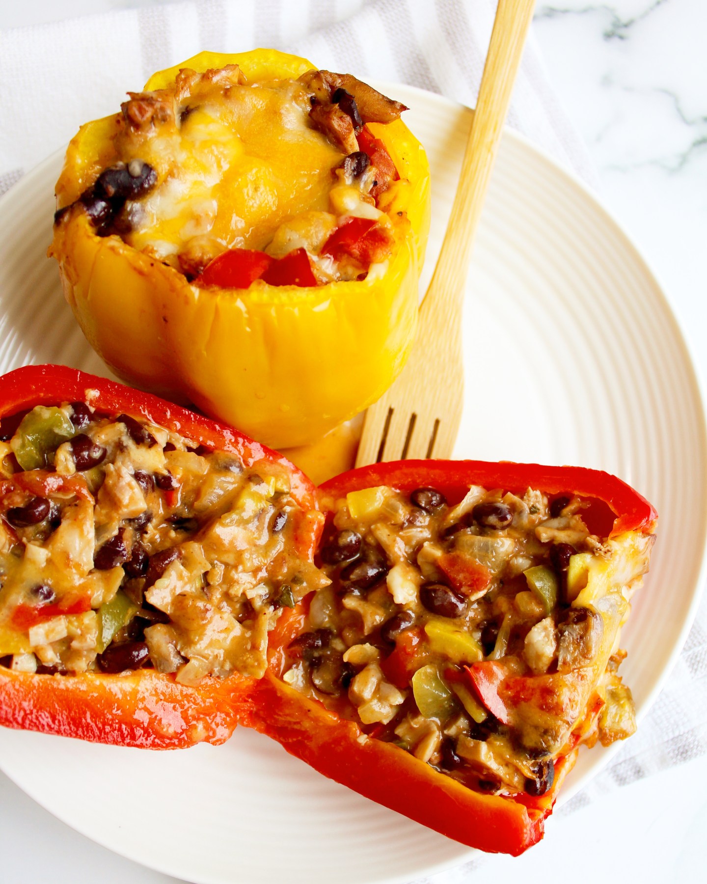 Yield: 4-6 servings Ingredients: 4-6 bell peppers, tops and seeds removed 2 Tbsp olive oil 1 onion, diced 1 yellow squash or zucchini, diced 1 garlic clove, minced ⅓ cup salsa 2 Tbsp cream cheese ½ cup enchilada sauce, split 1 can black beans, drained and rinsed 1 cup cooked chicken, diced or shredded 1 …